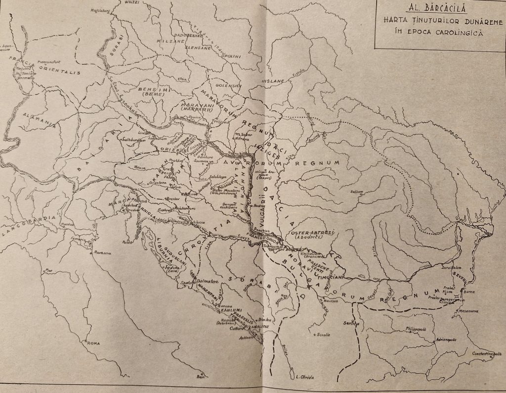 Cronicarul și funcționarul imperial Einhard, care mai era denumit în documente, ca Eginhard sau Einhart din latină a trăit între anii cc. 775 – 14 martie 840 și a fost un recunoscut savant și curtean franc. Einhard ca fost slujitor dedicat al lui Carol cel Mare și al fiului său Ludovic cel Cuvios scriind o operă monumentală, care este și o biografie a lui Carol cel Mare, intitulată ”Vita Karoli Magni”, fiind „una dintre cele mai prețioase moșteniri literare ale Evului Mediu timpuriu”. În prima jumătate al secolului XX un cunoscut istoric Alexandru Bărcăcilă, specializat pe istoria antică și feudalismului timpuriu, a scris despre un subiect istoric astăzi destul de ocultat. Amintesc că Alexandru Bărcăcilă a fost fondatorul muzeului Porților de Fier în 1912 și un istoric recunoscut în zona Olteniei și Banatului de sud, despre care a scris studii științifice consistente astăzi, din nefericire, uitate în colbul bibliotecilor și al arhivelor. Istoricul Alexandru Bărcăcilă a fost un erudit pe istoria localităților de la clisura Dunării și a scris despre vechiul oraș Drobeta Turnu Severin. El a publicat o broșură uitată azi de către istoriografia română: ”Dacia de la Dunăre. A Analelor France din secolul al IX-lea. Evenimente și probleme”, apărută șa Tipografia Colegiului Național Carol I din Craiova, în 1947. Broșura este un studiu extras din ”Arhiva Olteniei”, nr. 131-148, ianuarie 1944 – decembrie 1946. Studiul este scris cu acribie și râvnă științifică, dar din păcate apărut în contextul complicat al comunizării brutale a României nu a avut ecoul meritat în lumea academică și cu atât mai puțin în spațiul public. De aceea se explică faptul că nu a intrat în circuitul academic românesc din perioada comunistă, dar nici în cel post-decembrist, deși istoricul a fost o somitate la vremea sa, iar studiile sale sunt consistent construite pe școala pozitivistă germană. Istoricul se axează pe desființarea imperiului avar, dintre anii 791 – 798 de către împăratul franc Carol cel Mare. Francii au ajuns victorioși în zona Moraviei și Panoniei de azi întâlnind în luptele lor populații diverse, dar și o populație numită daci în Moravia, Panonia și pe râul Oder, care sunt catalogați de istoric, ca urmașii dacilor liberi rămași din vremea lui Burebista și în afara cuceririi traiane. Despre dacii din Panonia și Moravia a mai scris și Nicolae Iorga, dar Alexandru Bărcăcilă o face pe baza cronicilor din limba latină de la curtea împărătească a lui Carol cel Mare. Pe lângă slavi și bulgari, francii se izbesc de populația autohtonă a dacilor, numiți așa de către curteni, deși evident această populație era influențată și de civilizația imperiului roman care a stăpânit Panonia și o parte din Austria până în la prăbușirea imperiului. Este interesant că la începutul secolului IX populația autohtonă dacică atinsă de romanizare nu era încă numită vlahi sau valahi în documente, etnonimul acesta apare peste o sută de ani de la anul 800, ceea ce înseamnă că încă proto-românii mai aveau încă puternice conotații legate de tradițiile dacilor și nu intrase încă în mentalul colectiv occidental ca popor autohton latinofon. Vasile Bulgaroctonul îi menționează pe vlahi prima data într-un „hrisov” din 980 în contextul Vlăhiilor din Peninsula Balcanică. Despre aceasta relata cronicarul bizantin Kekaumenos în sec. XI. Amintirea dacilor era încă destul de puternică în imaginarul popoarelor occidentale și a imperiului Carolingian la sfârșitul secolului VIII. Istoricul Stelian Brezeanu consemna că prima mențiune bizantină a românilor nord-dunăreni sub etnonimul de daci a apărut în ”Lexiconul Suidas” din secolul al X-lea. Lexiconul conține un pasaj: „dacii, care acum se numesc pecenegi” ce se referă la realitățile etno-politice nord-dunărene. Deci termenul de ”daci” a fost folosit până în secolul X pentru vlahii sau românii autohtoni. După secolul X etnonimul ”daci” devine vlah în cronicile epocii, referindu-se la populațiile autohtone romanizate și latinofone. (Stelian Brezeanu, O istorie a Bizanțului, Editura Meronia București,2005, p.188). Și totuși, mai târziu, prin cronicile maghiare se amintește de un duce Gelu ”quidam balchhus” la sfârșitul secolului IX în Transilvania de nord-vest. Ar fi interesant ca istoricii să cerceteze această translație desfășurată în secolul IX de la denumirea de daci la cea de vlahi, când s-a produs acest declic documentar în mentalul cronicarilor germani, slavi și bizantini din evul mediu timpuriu. Posibil ca etnonimul de ”vlahi” să fi fost preluat de cronicarii occidentali de la cei bizantini pentru a descrie o populație traco-dacică romanizată și latinofonă. Până la contactul direct dintre carolingieni și bizantini, cronicarii occidentali prefereau să numească această populație autohtonă din arealul Europei centrale ca și daci, urmașii dacilor lui Decebal. Era un etnonim intrat în mentalul colectiv occidental. Iar apoi, prin filiera bizantină, se trece de la etnonimul traco-dac la cel de vlah. Menționez că vechile croncii latine vorbeau de goți, vizigoți și țara ”Dania”, ca urmași ai poporului dac, ceea ce arată puterea de seducție a civilizației dacilor în spațiul european. Conform hispanicilor sau ibericilor, dacii erau confundați cu vizigoții și sunt amintiți în secolul VIII în debutul luptei de Reconquista de sub stăpânirea maură. Dar aceasta este un alt subiect la care nu mp refer în acest studiu. Interesant e faptul că la începutul secolului IX populația din Panonia, Moravia și de pe Oder era denumită de cronciarii franci cu etnonimul de ”daci”. Aici intervine rolul istoricului Alexandru Bărcăcilă de a lămuri și problematica. Imperiul Carolingian s-a întins înspre te